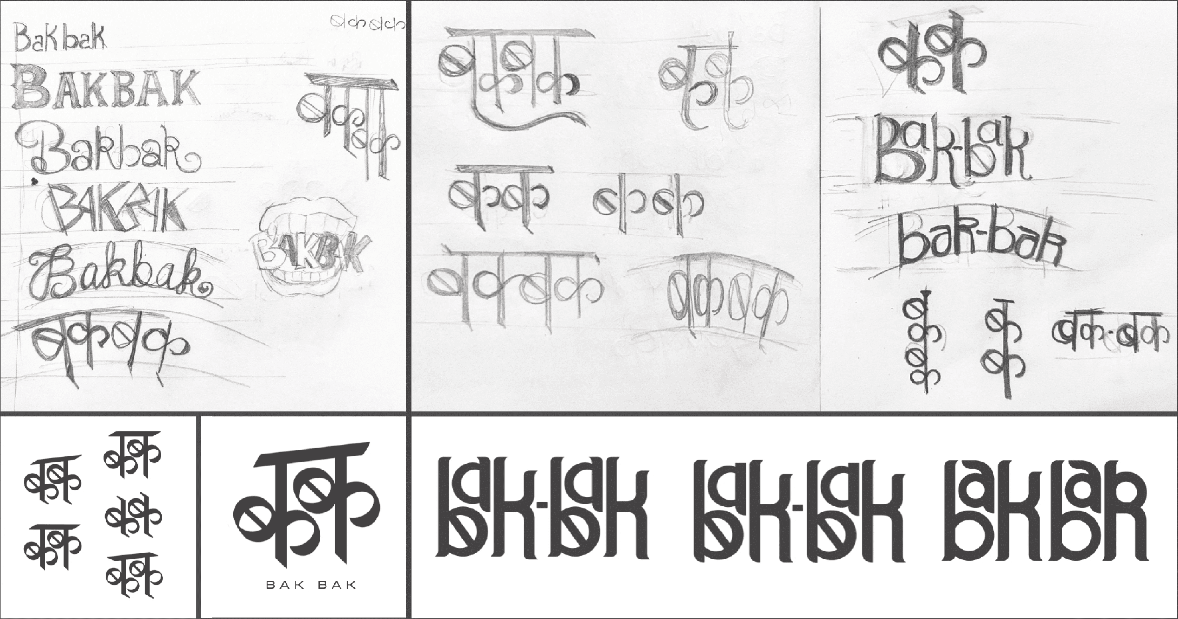 The logo exploration captures Bak Bak’s loud, expressive attitude through playful sketches and rhythmic letterforms that feel bold, chatty and street-inspired. The typeface reads in English but is shaped by Hindi script, creating a modern identity with a strong, culturally rooted voice.