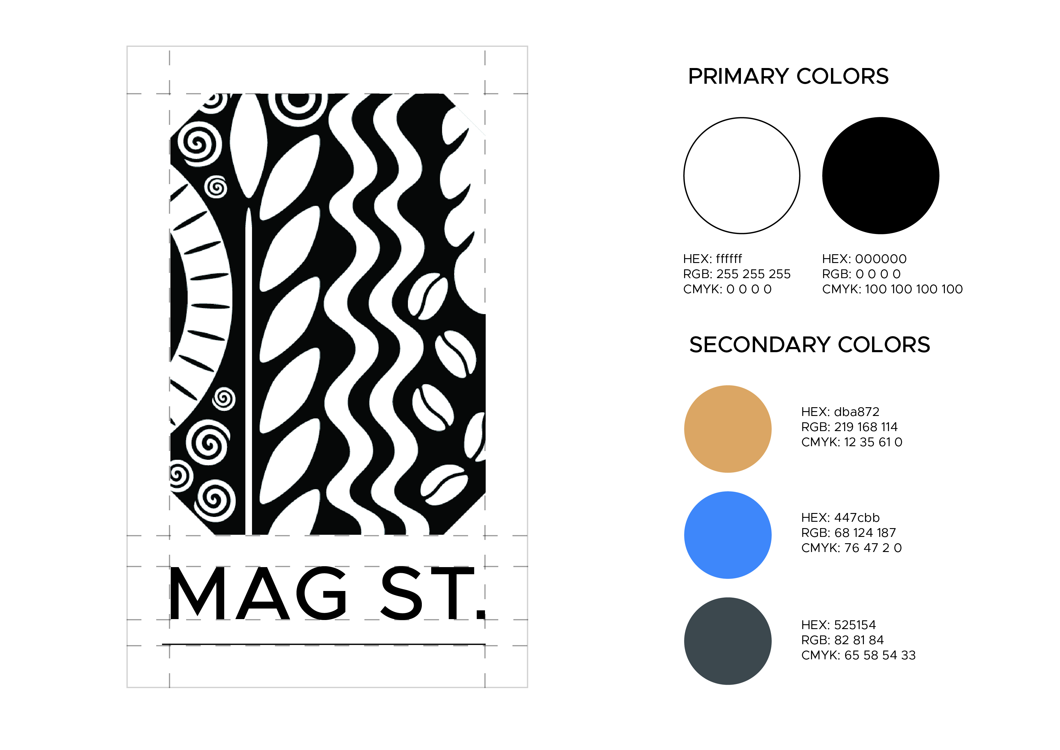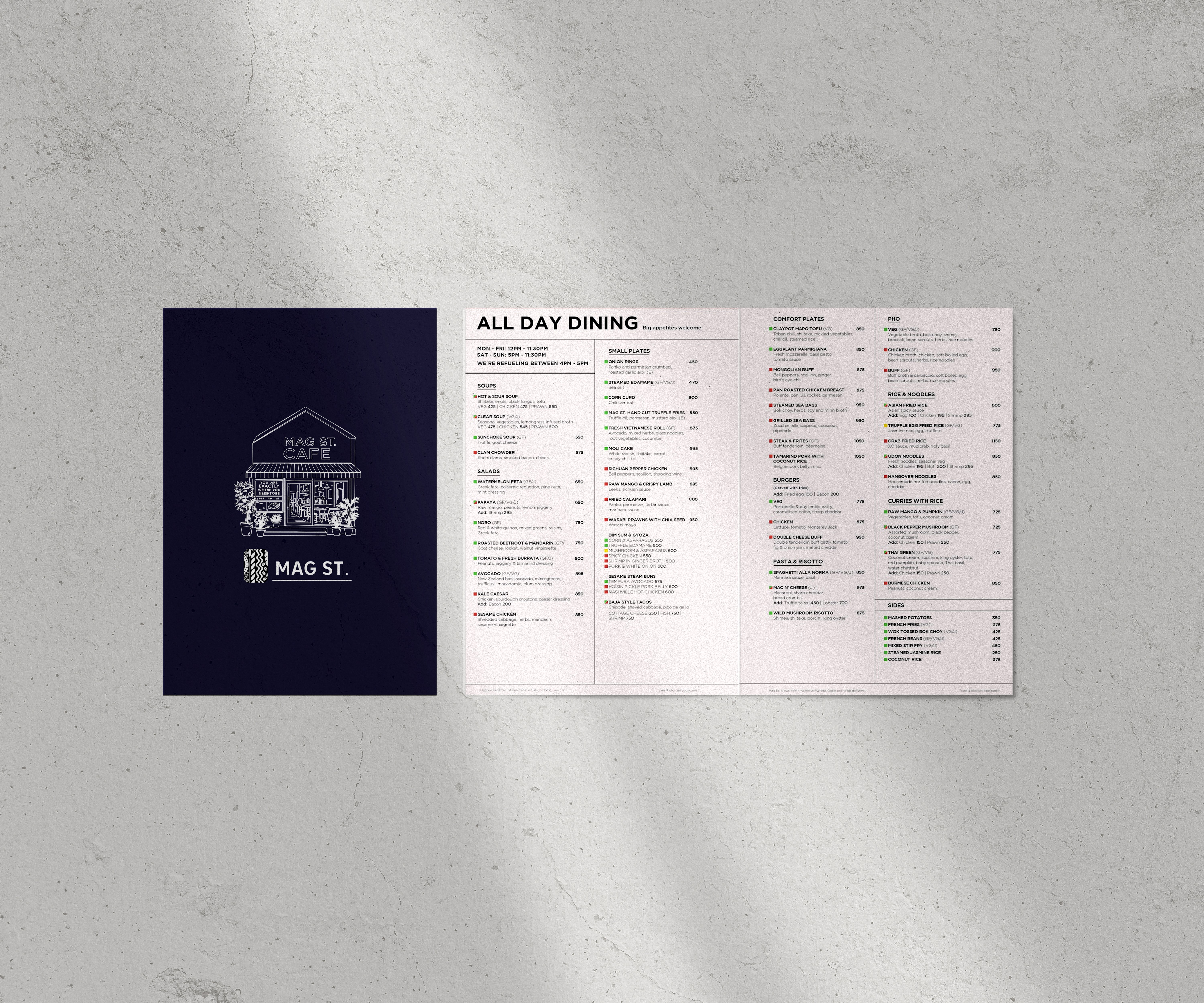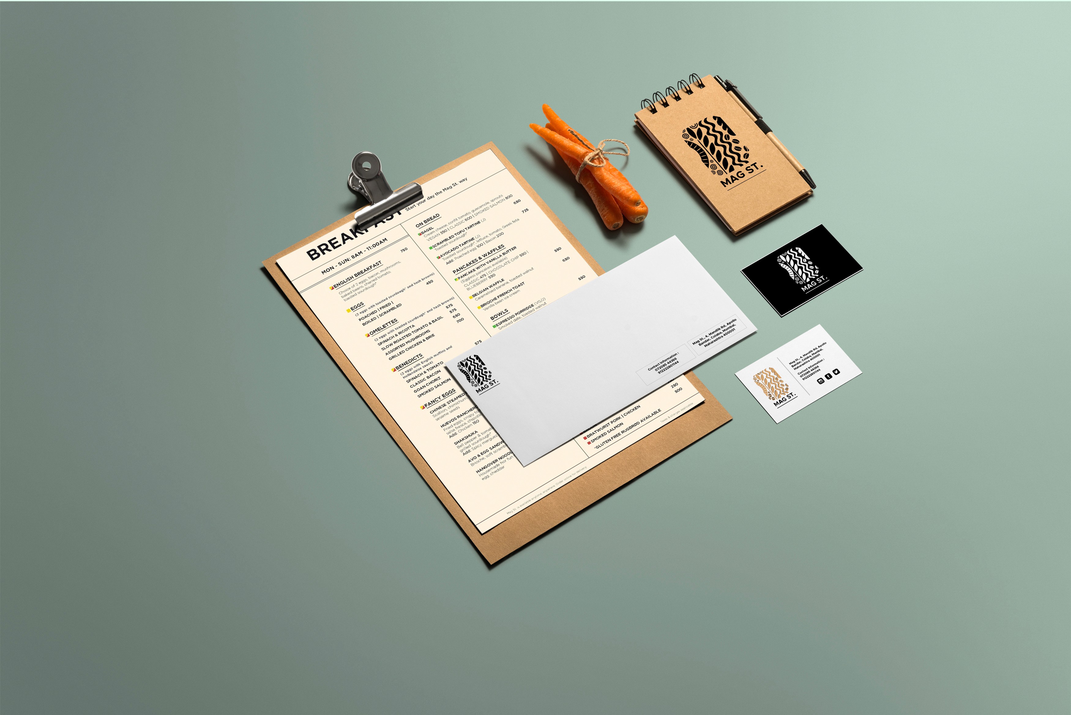 The logo blends personality with quiet sophistication, reflecting MAG ST.’s creative approach to flavour and shared dining. The black-and-white palette keeps the identity refined and approachable, while warm ochre, muted blue and soft grey add depth and character, creating a visual world that feels stylish, warm and full of life.